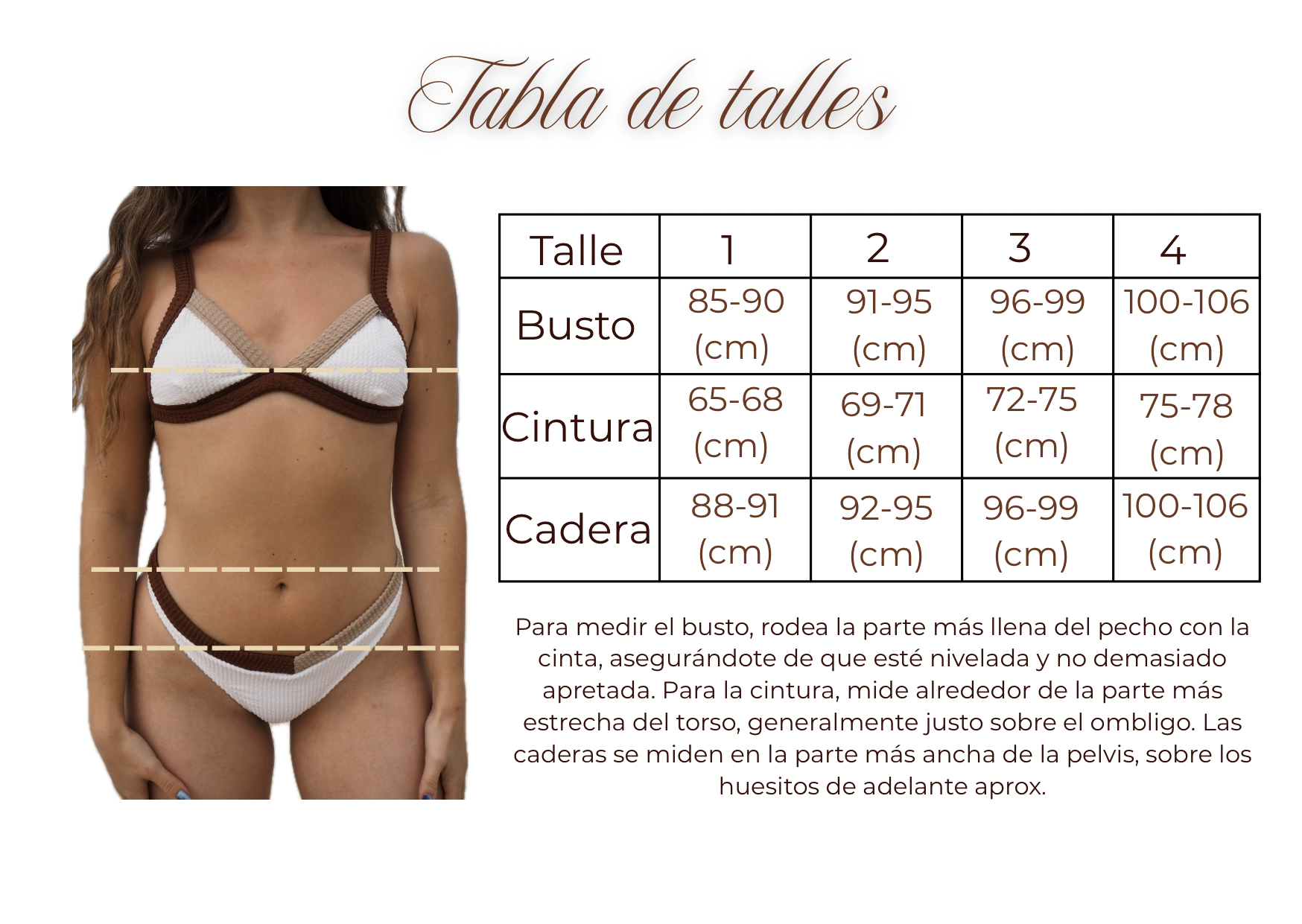 Corpiño triángulo de tela blanca tramada combinada con bordes en chocolate y nude. Posee breteles regulables anchos y la espalda tiene tres medidas para abrochar así eligen según su contorno de espalda. Lavar a mano con jabón blanco y dejarla estirada en la sombra para su secado. Resistente al cloro y al mar.