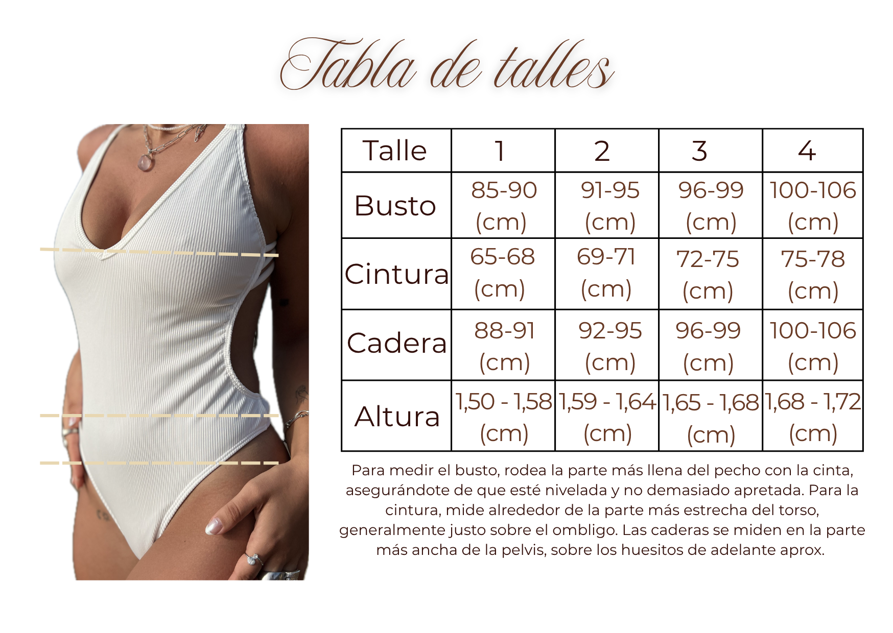 TALLES: En la enteriza Bardot es importante priorizar las medidas de cadera y altura a la hora de elegir el talle. Los talles son aproximados, si luego de tomarte las medidas seguis teniendo dudas nos podes escribir y te ayudamos!