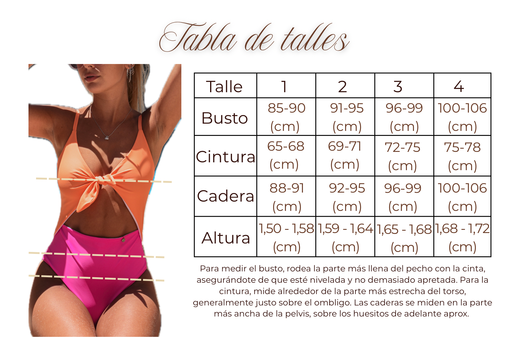 Enteriza de lycra combinada, fucsia y naranja. Como pueden ver en la foto, la parte delantera la pueden atar a su medida para mayor comodidad, además las tiritas de los hombros son regulables. Lavar a mano con jabón blanco y dejarla estirada en la sombra para su secado. Resistente al cloro y al mar. Lycra 80% poliester y 20% elastano.